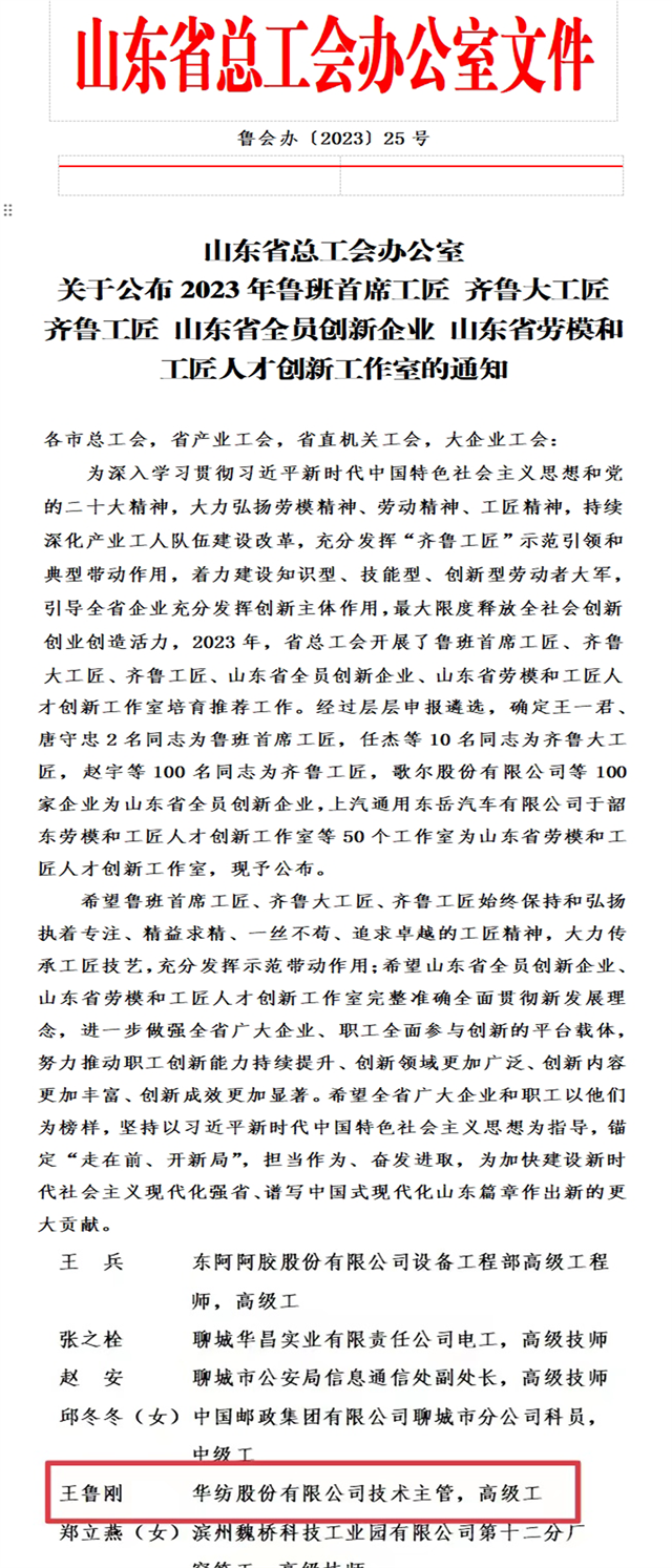 導(dǎo)讀:近日,省總工會下發(fā)通知,公布了多項(xiàng)獲獎名單,其中,公司面料車間技術(shù)主管、高級工王魯剛榮獲第六屆“齊魯工匠”稱號。