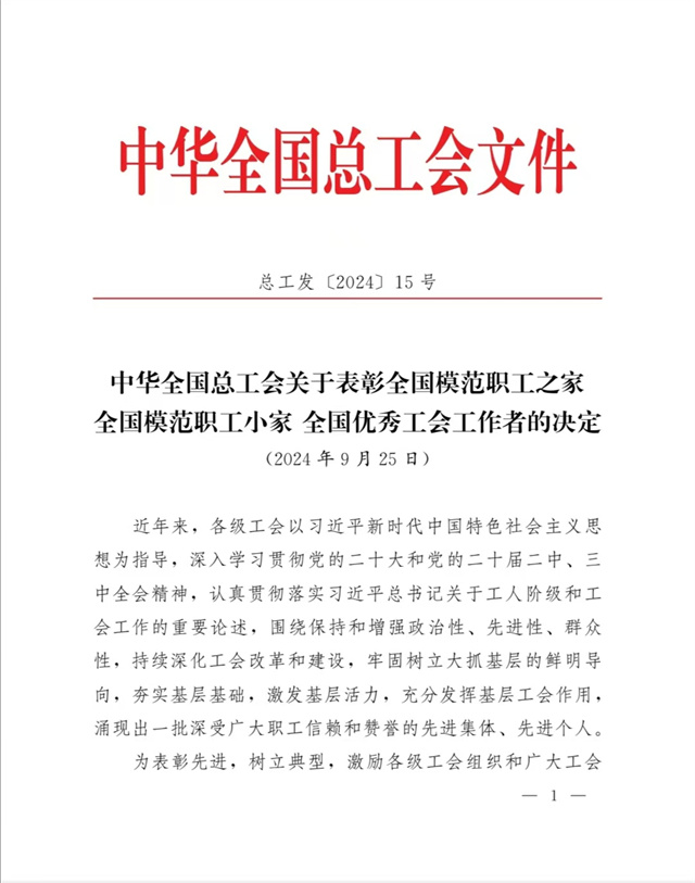 “全國(guó)模范職工之家”是中華全國(guó)總工會(huì)設(shè)立的授予全國(guó)工會(huì)系統(tǒng)先進(jìn)集體的最高榮譽(yù),是對(duì)基層工會(huì)工作的最高褒獎(jiǎng)和肯定。公司工會(huì)在公司黨委領(lǐng)導(dǎo)下,以習(xí)近平新時(shí)代中國(guó)特色社會(huì)主義思想為指導(dǎo),深入學(xué)習(xí)貫徹黨的二十大和黨的二十屆二中、三中全會(huì)精神,認(rèn)真貫徹落實(shí)習(xí)近平總書記關(guān)于工人階級(jí)和工會(huì)工作的重要論述,牢固把握正確政治方向,充分發(fā)揮橋梁紐帶作用,切實(shí)維護(hù)職工合法權(quán)益,努力構(gòu)建和諧勞動(dòng)關(guān)系,不斷增強(qiáng)工會(huì)組織的引領(lǐng)力、組織力、服務(wù)力,為公司高質(zhì)量發(fā)展貢獻(xiàn)工會(huì)智慧和力量。