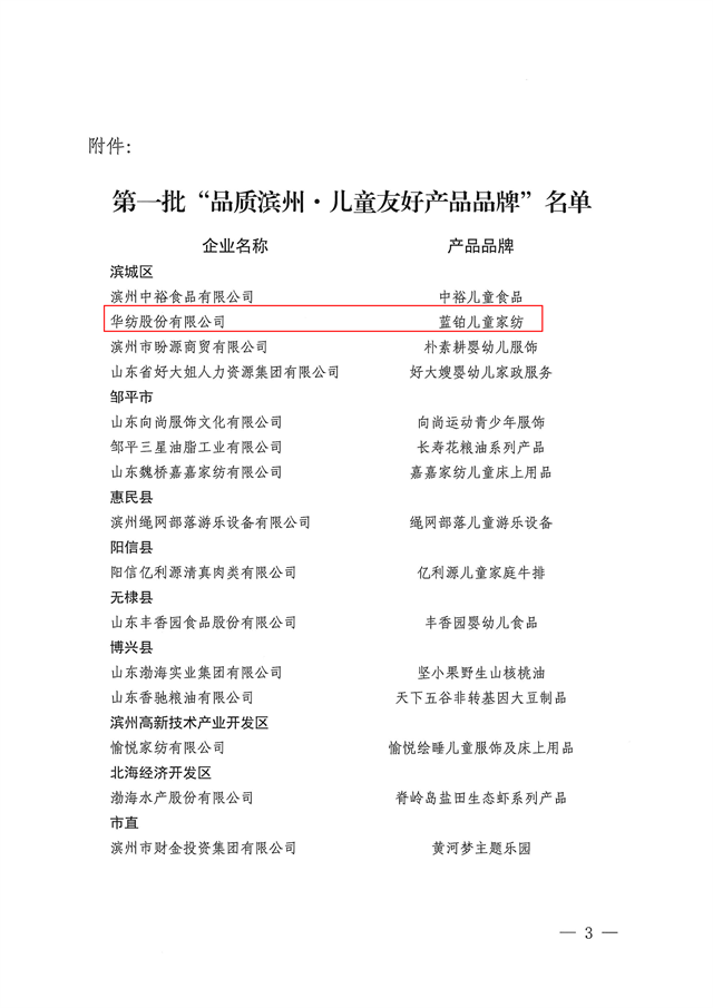 近日,市發(fā)展改革委、市婦聯(lián)、市市場監(jiān)管局聯(lián)合發(fā)布第一批“品質(zhì)濱州·兒童友好產(chǎn)品品牌”名單,公司藍鉑兒童家紡憑借卓越的品質(zhì)與貼心的設(shè)計成功入選。